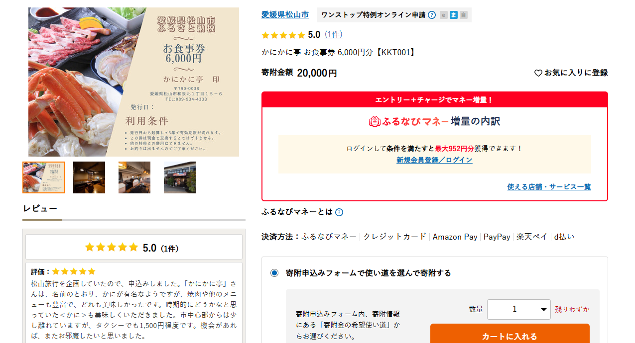 ふるさと納税で店舗を利用している者です。リーズナブル価格で食べられるあのカニがおうちでも食べられるなんて感激です。松山の温泉が好きで毎年松山へ旅行に来ています。